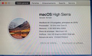 Portátil MacBook Air de 2015. Inclye cargador. OSX El Capitan versión 10.11.16. LA BATERÍA sin que el mac esté conectado es BASTANTE LIMITADA (1h-2h)!! Excepto la falta de autonomia funciona pefectamente. - 13,3 pulgadas--> 1440x900 (principios de 2015) - intel hd graphics 6000 15.36 mb - Procesador 1.6ghz intel core i5 - Memoria Ram 4GB 1600 MHz DDR3. - Almacenamiento 125 GB - Gráficos intel HD Graphics 6000 15:36MB - NÚMERO de serie. C1MQXCEJG940. - Diseño delgado y ligero. - Pantalla Retina. - Teclado retroiluminado.