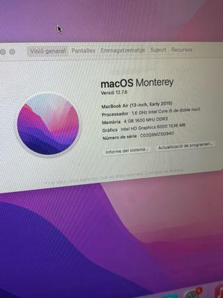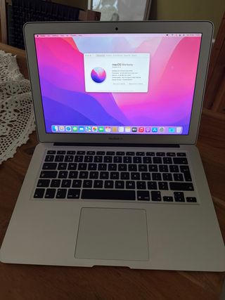 MacBook Air de 13 pulgadas (2015), modelo A1466. Comprado originalmente en Londres, por lo que el teclado es en inglés (pero el sistema se puede usar en español sin problema). Batería cambiada por Apple el 30/01/2023 en Barcelona. Dispone de 128 GB SSD, 4 GB de RAM y procesador Intel Core i5. Compatible hasta macOS Monterey. Color plata. Incluye cargador original: No en muy buen estado pero funcionando correctamente. -Ideal para navegación, trabajo de oficina, estudios, correo, streaming y tareas básicas.