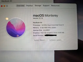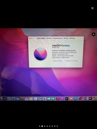 MacOS Monterrey , entregó SOLO Portatil y cargador. - MacBook Air del 2015 intel i5 - Memoria Ram 4Gb - Disco Sólido 120Gb ampliable - Grafica Intel HD 6000 - Batería con 589 ciclos de carga durando unas 6 horas viendo vídeos en YouTube - Teclado retro iluminado, web cam, bluetooth, etc. NO Envio NO cambio gracias, abstenerse regateos absurdos. Estéticamente bastante bien algún arañazo leve o marca de uso