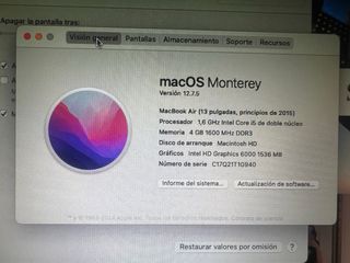 Macbook air principios 2015. Tiene cambio de Disco duro de 256Gb actualizado a Monterey.