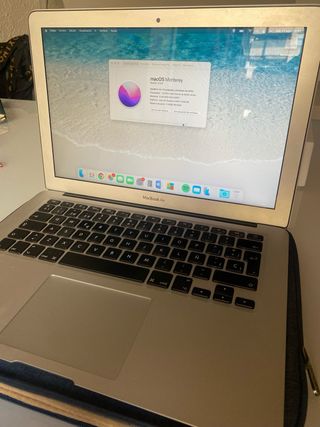Vendo mi MacBook Air en muy buen estado general. Es perfecto para estudiantes, teletrabajo ligero, navegación y tareas de oficina gracias a su ligereza y eficiencia. Características principales: • Pantalla: 13.3 pulgadas. • Procesador: Intel Core i5 de 1.6 GHz (doble núcleo). • Memoria (RAM): 4 GB DDR3 a 1600 MHz. • Almacenamiento: 128GB • Sistema Operativo: macOS Monterey (versión 12.7.6). El portátil funciona muy bien. Tiene una pequeña marca estética en la esquina superior derecha