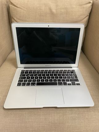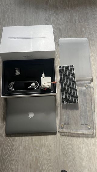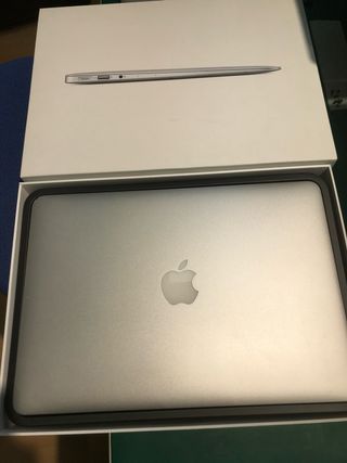 MacBook Air de principios de 2015. Excelente estado, muy cuidado, siempre en funda y con protección del teclado (se adjuntan imágenes). Funcionamiento excelente a día de hoy en cuanto a rendimiento. La batería dura poco tiempo sin enchufar por el uso, si se quiere larga duración inalámbrico habría que cambiarla. Cargador incluido. Precio negociable