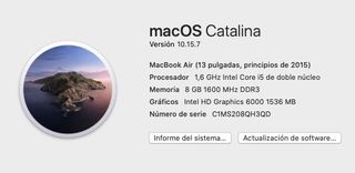 Ordenador MacBook Air 13 pulgadas de 2015. Procesador 1,6 GHz Intel Core i5 doble núcleo. Memoria 4GB 1600MHz DDR3. 251GB de memoria Ahora mismo tiene el macOS Monterey.