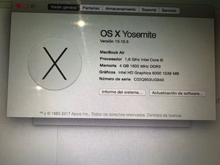 Portátil MacBook Air de 2017. - Diseño delgado y ligero. - Acabado en plata. Excelente condiciónes ideal para trabajos de oficinas macOS Monterey Versión 12.7.6 MacBook Air (13-inch, 2017) Procesador 1,8 GHz Intel Core i5 de doble núcleo Memoria 8 GB 1600 MHz DDR3 Gráficos Intel HD Graphics 6000 Informe del sistema