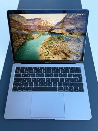 MacBook Air 13" 2019 modelo A1932 Space Gray. Procesador i5 a 1.6GHz, 8GB Ram, SSD 128GB. Pantalla Retina de alta resolución 2560x1600px (227 ppi) con True Tone. Batería nueva (1 ciclo, 103% de capacidad). Estado aceptable, con dos esquinas golpeadas (ver fotos). Teclado español retroiluminado. Dos puertos USB-C y salida de audio. Funciona todo perfectamente. Con cargador original de Apple.