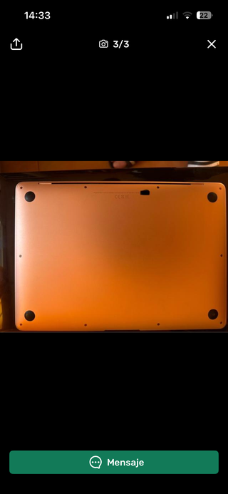 MacBook Air con chip Apple M1. Muy rápido y fluido. Batería con 393 ciclos y 88% de capacidad. Estado: – Funciona perfectamente – Pantalla ok – Teclado y trackpad ok – Presenta golpes en las esquinas inferiores (solo estética, ver fotos) – Marcas de uso en reposamanos Especificaciones: • M1 • 8GB RAM • 256GB SSD • Pantalla Retina 13.3” • macOS actualizado Entrega en Palma o envío. Precio ajustado por los detalles estéticos.