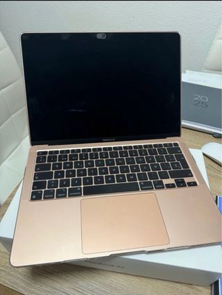 MacBook Air de 13 pulgadas del año 2020. Un portátil elegante y potente. Se vende en perfecto estado exterior. Funcionamiento perfecto. Tan solo la pantalla, aunque se ve perfecto, ha aumento de intensidad los colores (probablemente tenga arreglo facil). No obstante no influye nada en su rendimiento y tampoco es demasiado percetible. El mac procesa la informacion como un tiro. Excelente estado. Se vende con la caja original y cargador original - Diseño delgado y ligero. - Acabado en color oro rosa.