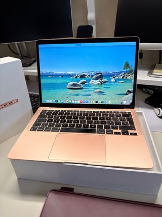 MacBook Air comprado en 2020 en un elegante acabado dorado/rosa. Un portátil ligero y potente para tu día a día. - Pantalla Retina. - Teclado retroiluminado. - Trackpad amplio. - IA incorporada. Ultimo sistema operativo actualizado. Sin signos de daños, perfecto estado.
