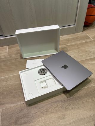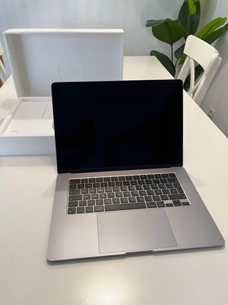 Portátil MacBook Air de 15 pulgadas gris en su caja original. - Salud de la batería al 100% / 42 ciclos de carga. - Capacidad de almacenamiento de 512 GB. - Incluye la caja original y accesorios. - Memoria RAM de 8 GB.