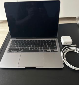 MacBook Air M1 de 2020 en color Gris Espacial. Un portátil ligero (1.29kg) y potente para el día a día. - Chip M1 de Apple 8 núcleos - 8GB en RAM - 256 GB disco SSD - Pantalla Retina - Teclado retroiluminado - TouchID - MacOS Tahoe 26.3.1 - Salud de batería 83% - Funciona perfectamente todo, se vende por compra de nuevo equipo. Con cubo de carga original sin cable. Sin caja Detalles de uso señalados en las fotos No cambios... Precio Final