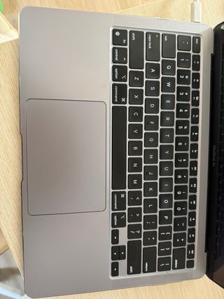 MacBook Air de 2020 con chip M1. Este portátil es ligero y potente, ideal para el día a día. - Pantalla Retina. - Teclado retroiluminado. - Trackpad Force Touch. - El portátil sigue funcionando de maravilla, sin embargo, tiene unos abollones pequeños en la parte de algunas esquinas. Ademas como se puede ver tiene una raya visible en la parte delantera. - Venta mediante transferencia bancaria. - Se vende con cargador, adaptador de corriente y funda.