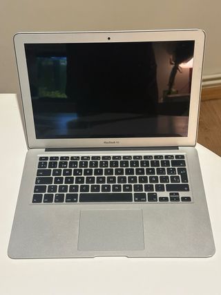 Portátil MacBook Air de 13 pulgadas con acabado plateado. - 8GB de memoria RAM. - Almacenamiento interno de 120GB. - 500 ciclos de batería. Aunque recomienda cambio de batería todavía aguanta unas 3-4 horas a medio rendimiento (viendo una peli por ejemplo). - Pequeño golpe en una esquina, no afecta al funcionamiento. - Cable del cargador original roto (el plástico externo) pero funciona perfecto. -Incluye cable hdmi y funda para el teclado con shortcuts Logic pro X