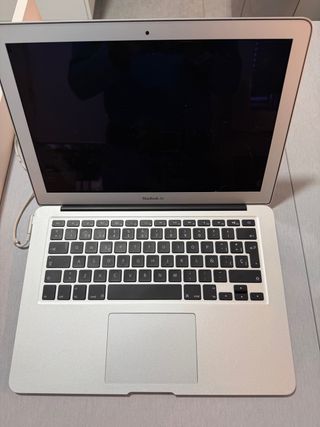 Portátil Apple MacBook Air en color plata. - Pantalla de 13 pulgadas. - Teclado QWERTY español. - Trackpad amplio. - 13”de mediados 2011 - Intel core I7 1.8ghz - 4gb memoria DDR3 - sistema operativo High Sierra - disco duro 250gb SSD - cargador nuevo - tiene un golpecito que no afecta al funcionamiento - funciona muy bien
