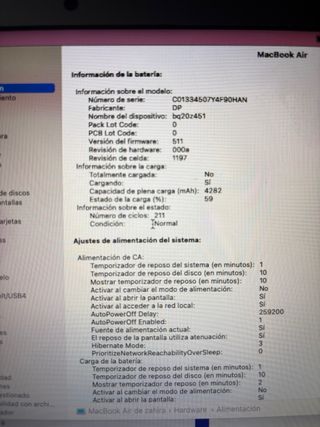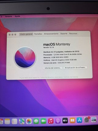 MacBook Air funcionando perfectamente. Tiene ya unos años (es del 2013) y no ha dado ningún problema pero tiene algunos signos de uso como algún arañazo en la cubierta una abolladura en una esquina (que no impide que la tapa cierre perfectamente) un par de muescas junto al puerto de carga y uno de los “pies” un poco roto (ver fotos). También necesita un cambio de batería (aunque todavía aguanta algo más de dos horas). Es el modelo de 128 GB de disco duro, y 8 GB de memoria RAM, y tiene un teclado Inglés. Más detalles en: "support.apple.com/kb/SP678?viewlocale=es_LAMR&locale=es_LAMR" Se entrega en su caja original, y sin cargador.