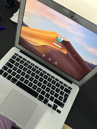 Macbook air de 13 pulgadas de 2014. en perfecto estado estético y funcional. Evidentemente, hay alguna aplicación que abre o funciona más lenta, pero no hay cuelgues ni mal funcionamiento. Se entrega formateado. Incluyo cargador, funda de Vans, y tiene una "pegatina"/ carcasa en la parte frontal, de forma que si la quitas, el ordenador te queda nuevo, ya que se puso al principio. No tiene marcas, la que se ve en la parte de atrás que es un punto negro pequeño (puedes verlo en las fotos). Lo que se ve "manchado" en la parte de la manzana es del vinilo blanco que tiene puesto. Mi recomendación es que lo quites cuando te lo quedes y así lo estrenas. Buen funcionamiento general de todo. Sistema operativo Mojave, puede actualizarse si se desea, aunque prefiero dejarlo así, ya que funciona bien y rápido
