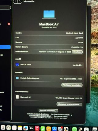 Macbook Air de 15 pulgadas, modelo 2025. Con caja Original. Memoria 16GB 256GB Almacenamiento. 17 ciclos Garantía hasta Apple hasta Junio del 2026. Garantía de Mediamarkt por un valor de 179€ hasta 27 de Junio del 2028 traspasable al comprador. Entrega en mano o envío