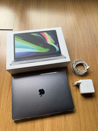 MacBook Pro en excelente estado, como nuevo. Usado conectado a monitor el 95% del tiempo. Batería muy bien cuidada (mantenida con app Aldente Pro) de ahí tan buena salud de batería y pocos ciclos de carga. Sin golpes ni arañazos (carcasa de plástico desde el primer día). Incluye cargador y cable original. - Chip M1 - 8GB de memoria RAM - 512GB de almacenamiento SSD - Salud batería 97% - 107 ciclos de carga - Teclado latino (cambia de sitio algún signo de puntuación, ver foto teclado)
