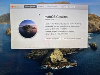 Portátil MacBook Pro con sistema operativo macOS Catalina. - Pantalla de 13 pulgadas. - Procesador Intel Core i5. - 8 GB de memoria RAM. - Disco SSD de 128 GB. - Gráficos Intel HD Graphics 4000. - Solo MacBook sin cargador lo entrego cagado para que se pruebe