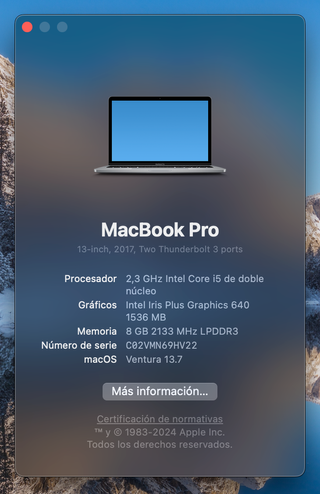 Portátil MacBook Pro de 13 pulgadas con sistema operativo macOS. - Modelo: MacBook Pro 13 - Versión de macOS: 12.7.6 Esta perfecto estado muy bien cuidado es de mi uso lo vendo x que me compre una nueva y ya no la uso.