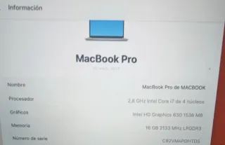 Portátil MacBook Pro de 15 pulgadas, modelo de 2017. Recibí el ordenador enseguida. Mi pantalla estaba rota. Puedo usarlo por HDMI conectándolo a la pantalla de un ordenador. Todo carga rapidísimo. 730 ciclos de carga. El teclado funciona de maravilla, sin problemas con las teclas. También puedo mantener los programas instalados (Windows, etc.). Sin iCloud Especificaciones: Procesador: Intel Core i7 de 4 velocidades con una velocidad de reloj de 2,8 GHz. Gráficos: Radeon Pro 555 de 2 GB, Intel HD Graphics de 1536 MB. Tamaño: 16 GB, 2133 MB LPDDR3. Disco duro: Disc - Pantalla Retina. - Teclado retroiluminado. - Trackpad amplio.