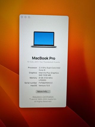 MacBook Pro 13" 2017 Corei5 doble nucleo 2,3GHZ 8GB ram, macOs Ventura 13.6.6 256GB Macintosh HD