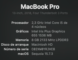 MacBook Pro de 13 pulgadas de 2018 en buen estado. Requiere una pila nueva. - Procesador Intel Core i5 de 2.3 GHz con 4 núcleos. - Gráficos Intel Iris Plus Graphics 655. - 8 GB de memoria RAM LPDDR3. - Almacenamiento de 256 GB. - macOS Sequoia 15.7.3