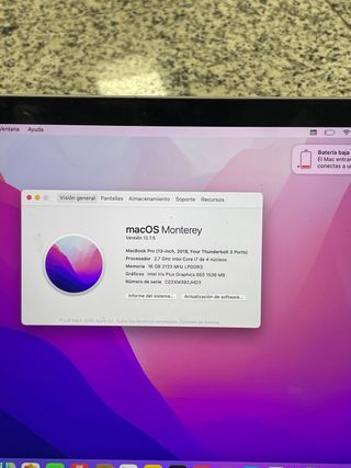 MacBook Pro de 15 pulgadas, modelo de 2018. Tiene un procesador Intel Core i7 y 16 GB de RAM. - Procesador Intel Core i7 - 16 GB de RAM Estado: Funciona perfectamente. Se recomienda cambiar batería. Pantalla totalmente funcional, pero tiene una pequeña grieta en el marco inferior (no afecta a la pantalla, solo estética) causada al limpiarlo. También pueden aparecer leves coloraciones por temperatura en uso intensivo, comunes en los modelos antiguos. No afecta al rendimiento, solo es visual si se fija uno.