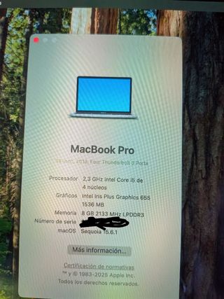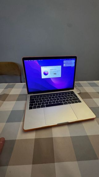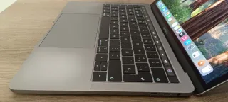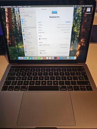 MacBook Pro de 13 pulgadas del año 2018 con Touch Bar en muy buen estado. Características: • Modelo: MacBook Pro Retina 13” 2018 • Procesador: Intel Core i5 de 8a gen • RAM: 8 GB • Almacenamiento: 256 GB SSD ultra • 4 puertos USB-C • Teclado español • Touch Bar y sensor de huella (Touch ID) • Sistema operativo Sequoia 15.7 listo para usar • Batería en buen estado, 200 ciclos • Gráfica: Intel Iris Plus Graphics 655 • Dimensiones 34.9x13.7x1.5 cm • 1,83 Kg Incluye cargador original . Tiene un pequeño bollito por debajo y se notan algo las marcas de las pegatinas que tenía en la solapa.