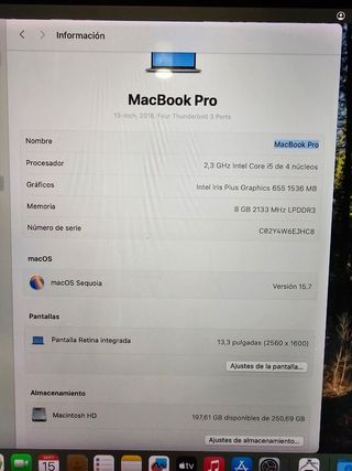 MacBook Pro de 13 pulgadas, modelo 2018, con cuatro puertos Thunderbolt 3. Procesador Intel Core i5 de 2,3 GHz Quad-Core y 16GB de RAM. En muy buen estado!!! - Gráficos Intel Iris Plus. - 16 GB de memoria RAM LPDDR3. - 256 GB de HDD - Número de serie: C02XG0MJJHD2. - macOS Sequoia 15.7.1.