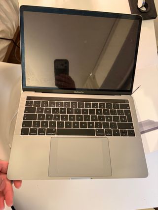 Portátil MacBook Pro de 13 pulgadas con Touch Bar, modelo de 2019. - Procesador Intel Core i5. - Pantalla Retina. - Acabado plateado. - SSD 128-8 GB -tiene un pequeño rasguño en el lateral, en imperceptible y no interfiere con la pantalla - Cargador, menos el cable, solo lo que conecta a corriente eléctrica