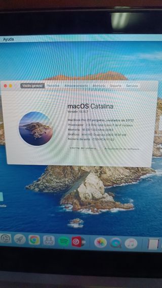 Portátil MacBook Pro de 13 pulgadas, modelo de mediados de 2012. Funciona con macOS Catalina. Tiene bastante uso, pero esta bien tratado. No tiene golpes ni abolladuras. Incluye caja original y funda de cuero de regalo. - Pantalla de 13 pulgadas. - Procesador Intel Core i5. - 16 GB de RAM, ampliada de 4 GB originales - 2 Discos duros: - HDD de 500 GB. - SSD de 250 GB. (Instalado en sustitución de unidad DVD - Batería estado normal. 725 ciclos