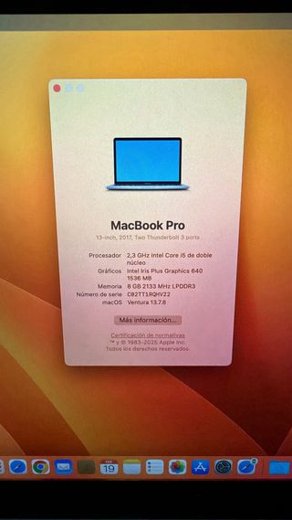 vendo portátil MacBook Pro de 13 pulgadas del año 2017 en color gris espacial. Bateria con 86 ciclos de carga, usado poquisimo, unico dueño. un maletin de transporte de regalo y el cargador original. venta en mano o envio pero preferiblemente entrega en mano en Galdakao - Procesador 2,3 GHz Intel Core i5 de doble nucleo - Gráficos Intel Iris Plus Graphics 640 1536 MB - Memoria 8 GB 2133 MHz LPDDR3 - Capacidad 128gb - Color gris espacial.