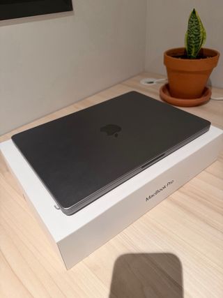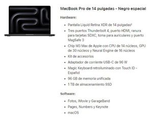Ultra potente MacBook Pro de 14 pulgadas - Negro espacial Nuevo precintado con factura (4969€). Ideal para desiñadores graficos, progamación y uso cotidiano. Hardware: Pantalla Liquid Retina XDR de 14 pulgadas² Tres puertos Thunderbolt 4, puerto HDMI, ranura para tarjetas SDXC, toma para auriculares y puerto MagSafe 3 Chip M3 Max de Apple con CPU de 14 núcleos, GPU de 30 núcleos y Neural Engine de 16 núcleos Kit de accesorios Adaptador de corriente USB‑C de 96 W Magic Keyboard retroiluminado con Touch ID - Español 96 GB de memoria unificada 1 TB de almacenamiento SSD