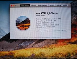 Macbook Pro de 13 pulgadas, de mediados de 2010, en buen estado. - Procesador 2.4 GHz Intel Core 2 Duo - Memoria: 16 GB 1067 MHz DDR3 - Disco de arranque macOS - Gráficos NVIDIA GeForce 320M 256 MB como veis he ampliado la memoria y la Ram, viene con cargador no original y tiene una linea fina en la pantalla que es solo estetico porque no impude ver bien la pantalla y la pantalla funciona perfectamente.