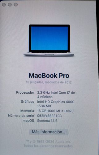 Macbook Pro Late 2013 de 15,4 pulgadas con 16GB de RAM y 500GB de disco SSD. Intel core i7 de 4 nucleos a 2,3GHz. Puertos: 2 Thunderbolt 2, 2 USB3, HDMI, lector de tarjetas SDXC. En perfecto estado, batería nueva con 50 ciclos y al 100% de capacidad que carga a 15-20 Watts. Funciona perfectamente y esta impecable salvo algo de condensacion alrededor de la pantalla (ver fotos) pero no en pantalla retina. Sigue siendo una maravilla. Se entrega con iOS Big Sur 11,7.