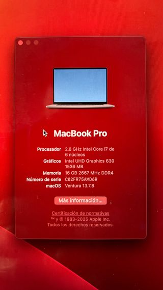 MacBook Pro de 13 pulgadas, modelo de 2019, comprado en esa fecha en la página de Apple reacondicionados,con dos puertos Thunderbolt 3. Este equipo cuenta con un procesador Intel Core i5 de 4 núcleos y gráficos Intel Iris Plus Graphics 645. - Pantalla: 13 pulgadas - Procesador: 1,4 GHz Intel Core i5 (4 núcleos) - Gráficos: Intel Iris Plus Graphics 645 (1536 MB) - Memoria RAM: 8 GB 2133 MHz LPDDR3 - Número de serie: C02YWGPKL40Y - Sistema Operativo: macOS Sequoia 15.7.1 El ordenador está en un estado impecable, no tiene absolutamente ninguna marca, se entrega con cable y cargador original.No cambios. comprado en esa fecha en la pági