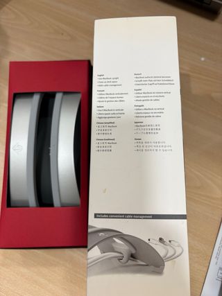 Soporte vertical para MacBook, ideal para organizar tu espacio de trabajo. - Diseño elegante en color plateado. - Permite colocar el MacBook en posición vertical.
