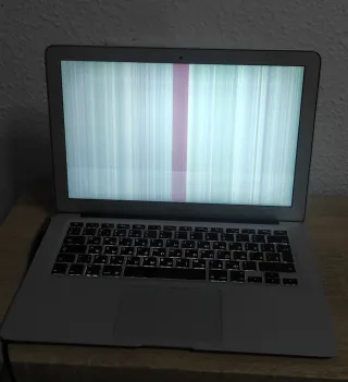 MacBook Air 13” (Modelo A1466). Intel Core i5, 4 GB de RAM, sin SSD. Pantalla no funcional (líneas), la batería no mantiene la carga. Presenta arañazos y pequeños golpes en las esquinas. Para piezas o reparación. Incluye adaptador Tipo-C a MagSafe 2.