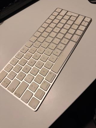 Vendo teclado Apple Magic Keyboard original (modelo A1644) en color blanco y aluminio. Funciona perfectamente y se conecta por Bluetooth, ideal para Mac, iMac, MacBook o incluso iPad. El teclado está usado pero en buen estado general. Presenta algunas marcas de uso en la base (se pueden ver en las fotos), algo normal del uso sobre escritorio, pero las teclas funcionan todas perfectamente. Batería recargable integrada mediante Lightning. No incluyo el cable. La caja original podría buscarla, aunque ahora mismo no la tengo localizada. Perfecto si quieres un teclado Apple original a buen precio.