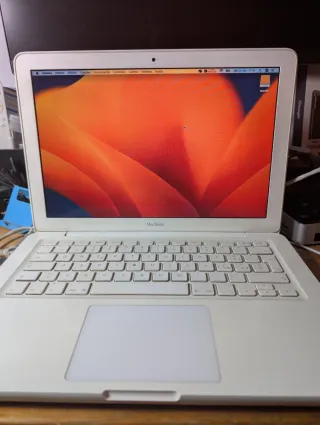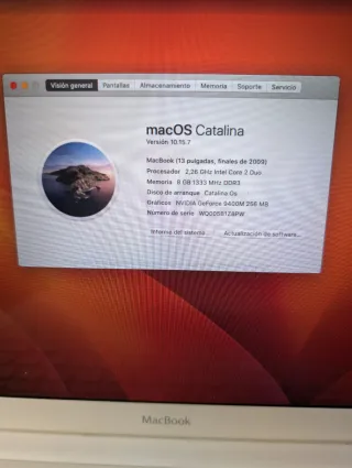 MacBook Unibody de 2009. Un portátil clásico con un diseño elegante. - Carcasa de plástico - Teclado completo italiano configurado español - Trackpad amplio. -Actualizado a Catalina 10.15.7 -Ampmiada memoria a 8 GB -Programas útiles diversos instalados. --Lleva Office instalado (también se puede poner -office de Apple. -Se ha instalado programa de mantenimiento -Realisado limpieza y cambio de pasta GPU y CPU -Funcionamiento correcto teclado tracpad y -puertos USB, salida de video -Se entrega cargador genérico nuevo -Bateria con 479 ciclos condición normal