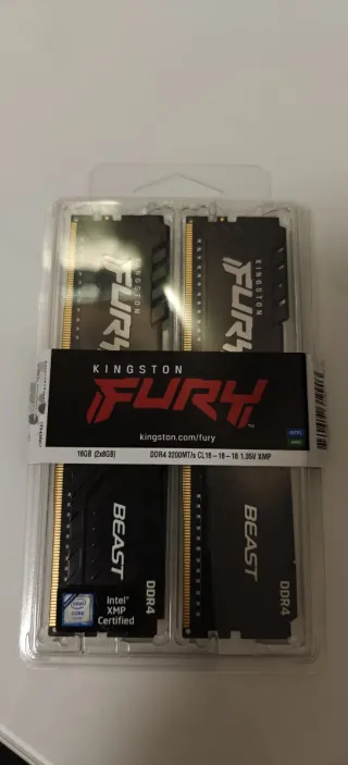 Kit de dos módulos de memoria RAM Kingston FURY Beast. - Capacidad total: 16GB (2 x 8GB). - Velocidad: DDR4 3200MT/s. - Latencia: CL16-18-18. - Voltaje: 1.35V. - Certificación Intel XMP.