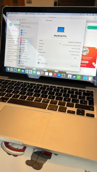 Se vende MacBook Pro de mediados de 2014, modelo A1502. - Procesador Intel Core i5 de doble núcleo a 2.8 GHz. - 8 GB de memoria RAM DDR3. - Pantalla Retina de 13 pulgadas. - Almacenamiento de 128 GB SSD. - macOS Monterey instalado. Incluye cargador original y ratón inalámbrico marca Omoton, el único fallo es el altavoz derecho se puede solucionar con uno de Amazon por precio inferior a 20 euros.