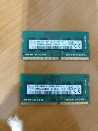 Pack de dos módulos de memoria RAM SK hynix de 4GB cada uno. - Capacidad total: 8GB (2 x 4GB). - Tipo: DDR4 SODIMM. - Velocidad: 2666MHz. - Referencia: HMA851S6DJR6N-VK.