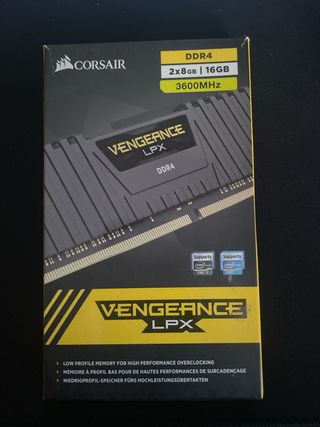 Kit de memoria RAM Corsair Vengeance LPX. - Capacidad total: 16GB (2 módulos de 8GB cada uno). - Tipo de memoria: DDR4. - Velocidad: 3600MHz. Nunca se le han hecho overclock. Nuevas prácticamente.