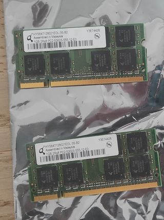 2 módulos memoria RAM SODIMM DDR2 para portátil. 2 módulos de 1gb cada uno (2gb en total). 667 mhz de frecuencia y clase 5. Envíos rápidos con walapop envíos.