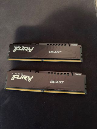 Kit de memoria RAM Kingston FURY Beast DDR5, 2X16Gb en perfecto estado estético y de funcionamiento Modelo: KF552C40BBK2-32 • Velocidad: 5200 MT/s (MegaTransfers por segundo). • Latencia: CL40. • Voltaje: 1.25V. • Perfil: Compatible con Intel XMP 3.0 para configuración automática de velocidad. Tambien compatible con la serie 7000 de AMD Ryzen