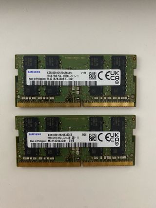 Dos módulos de memoria RAM DDR4 de 16GB cada uno, para portátil. - Capacidad total: 32GB (2x 16GB). - Tipo de memoria: DDR4. - Formato: SODIMM (para portátiles). - Velocidad: PC4-3200AA (3200MHz) y PC4-2666V (2666MHz).
