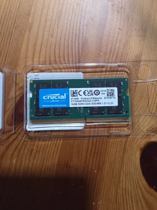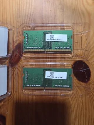 Se venden dos módulos de memoria RAM Crucial. - Capacidad: 16 GB por módulo (total 32 GB). - Tipo: DDR4 SODIMM. - Velocidad: 3200 MHz. - Voltaje: 1.2V. - Latencia: CL22.