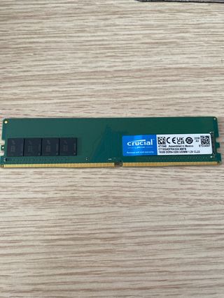 Módulo de memoria RAM Crucial de 16GB para PC de escritorio. - Capacidad: 16GB - Tipo: DDR4 UDIMM - Velocidad: 3200MHz - Voltaje: 1.2V Está totalmente nuevo, solo se ha usado una única vez para ver si funcionaba