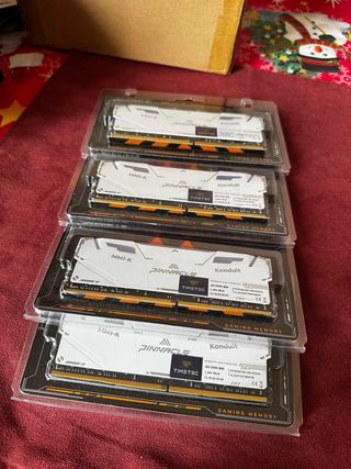 PRIMERA MANO y Envío al día siguiente de la compra. Vendo sin usar ni abrir el Timetec Pinnacle Konduit DDR4-3600 CL18 128GB (4x32GB). No esperes a que siga subiendo de precio las memorias ram. Conjunto de 4 módulos de memoria RAM DDR4 de 32 GB cada uno, para un total de 128 GB. Diseñados para gaming. - Modelo: Konduit - Capacidad total: 128 GB (4 x 32 GB) - Tipo de memoria: DDR4 - Velocidad: 3600 MHz - Latencia: CL18 - Voltaje: 1.35V tags: memoria ram, memoria ram barata, 128gb ddr4, memoria ram a buen precio, españa, palma, mallorca, modulo de memoria ram